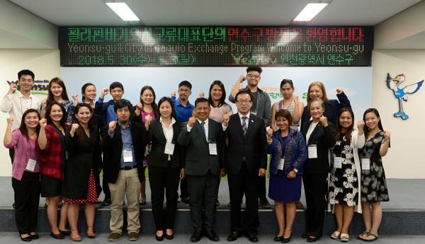 필리핀 바기오시 교류 대표단 22명이 30일 인천 연수구를 방문했다. 이번 대표단 방문은 해외우호 교류도시와의 학생 국제교류 프로젝트의 일환으로 지난 1월 연수구 학생대표단의 바기오시 방문에 이은 것이다. 사진은 관계자들이 기념촬영을 하는 모습. (사진제공=연수구청)