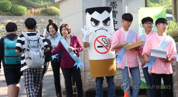 서울시교육청 직원들과 숭실중학교 학생, 교직원들이 31일 오전 세계금연의 날을 맞아 서울 은평구 숭실중·고등학교 정문에서 학생 흡연예방을 위한 '블루리본 캠페인' 을 펼치고 있다.
