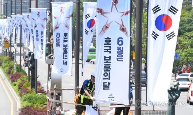6월 호국보훈의 달을 하루 앞둔 31일 서울 송파구 올림픽로에서 구청 관계자들이 호국보훈기와 태극기를 게양하고 있다.