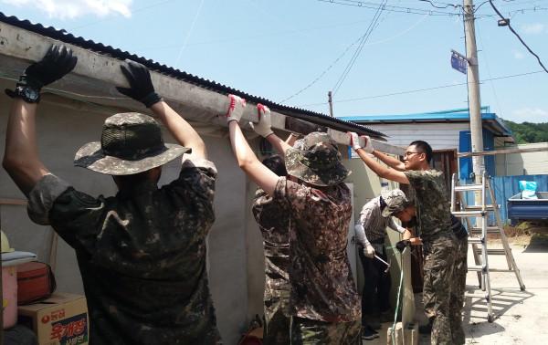 경기 포천시북부희망복지센터는 1일 일동면 행정복지센터 및 영중사랑나눔회, 육군 95정비대대 참수리봉사단, 일동면 적십자봉사회와 연계해 일동면 소재 저소득 취약계층 장애노인 가구를 대상으로 주거환경개선사업을 실시했다. 사진은 봉사활동에 참여해 집수리를 하고 있는 군 장병들의 모습.(사진제공=포천시청)