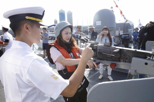 최근 열린 ‘2018 화성 뱃놀이 축제’ 행사장에서 ‘제2차 연평해전’에서 산화한 전사자들을 기억하자는 취지로 ‘참수리급 함정 탑승행사’가 진행됐다. 사진은 참수리급 군함에 탑승한 관광객이 기관총 사격을 모의체험하고 있는 모습.(사진제공=화성시청)
