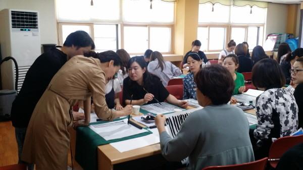 경기 가평군에 소재한 청평초등학교는 매주 금요일 2시간씩 8주간 인근지역 주민 및 학부모를 대상으로 평생교육 캘리그라피 교실을 운영하고 있다. 사진은 지난 1일 교육에 참여한 주민들이 캘리그라피 선 긋기에 대해 배우고 있는 모습.(사진제공=청평초등학교)