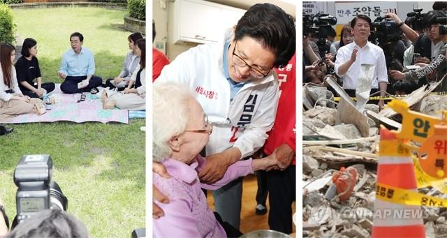 더불어민주당 박원순 서울시장 후보와 대학생들이 4일 서울 숙명여대캠퍼스에서 도시락 토크를 하고 있다(맨 왼쪽). 자유한국당 김문수 서울시장 후보가 4일 오전 서울 성수동 성삼경노당을 찾아 어르신들과 만나고 있다. 바른미래당 안철수 서울시장 후보가 4일 오후 전날에 이어 서울 용산구 한강로2가 건물붕괴 현장을 방문해 취재진 질문에 답하고 있다.