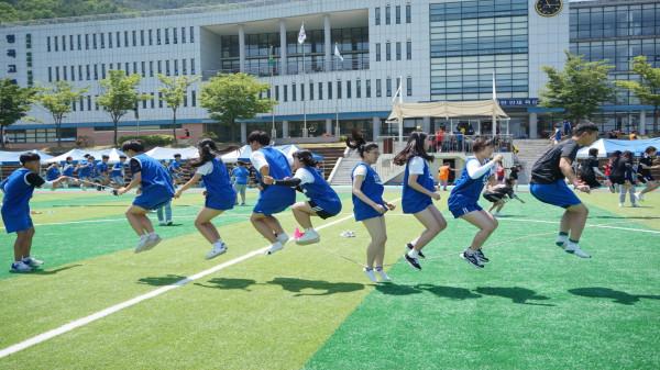 경북 구미시 형곡고등학교는 최근 학교 운동장에서 '2018 한마음 체육대회'를 개최했다. 이날 학생들은 축구, 피구, 파도타기, 2인3각 계주, 단체줄넘기, 미션달리기, 줄다리기, 400m계주 등 7개 종목에서 열띤 경합을 펼쳤다. 사진은 학생들이 단체줄넘기를 하고 있는 모습. (사진제공=형곡고등학교)