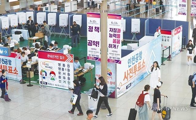 제7회 전국동시지방선거 및 국회의원 재보궐선거의 사전투표(8∼9일)를 하루 앞둔 7일 오후 인천국제공항 1터미널 출국장에 설치된 사전투표소에서 인천시선관위 직원들이 최종 점검을 하고 있다.