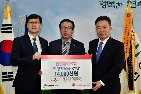 렛츠런 문화공감센터 인천연수는 인천사회복지공동모금회를 통해 연수구에 지역내 저소득층을 위한 복지사업에 써 달라며 민관협력사업 후원금 1400만원을 지정기탁했다. 사진은 관계자들이 기념촬영을 하는 모습. (사진제공=연수구청)