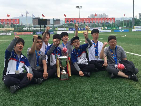 경기 이천시 다원학교 강승우군(고1)이 최근 열린 ‘제12회 전국장애학생체육대회’에 디스크골프 경기도 대표로 출전, 퍼팅 종목 은메달과 종합 2위의 성적을 거뒀다. 사진은 강군 등 학생들이 트로피와 함께 기념촬영을 하는 모습. (사진제공=이천교육지원청)