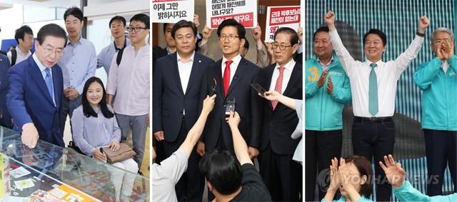 더불어민주당 박원순 서울시장 후보가 10일 오전 서울 광화문광장 해치마당에서 열리고 있는 ‘광화문광장과 함성’ 전시회를 87년생 청년들과 관람하고 있다. 자유한국당 김문수 서울시장 후보가 10일 오전 국회 정론관에서 대국민호소 기자회견을 한 뒤 기자들의 질문에 답하고 있다. 바른미래당 안철수 서울시장 후보(가운데)도 서울 잠실새내역 사거리에서 손학규 선대위원장 등과 함께 거리합동유세를 하며 손을 번쩍 들고 있다.