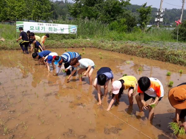 최근 서울 구로구 수궁동에 위치한 농촌 체험 학습장인 ‘수궁골 메뚜기’에서 온수초등학교 4학년 30명이 모내기 체험 행사에 참여, 직접 모내기 체험을 실시했다. 사진은 못줄에 맞춰 모를 심고 있는 아이들의 모습. (사진제공=구로구청)