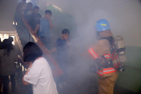 은평소방서는 11일 대조초등학교에서 재난 발생시 관계자의 신속한 초기 대응 능력을 키우고 소방대원의 현장 대응 능력을 강화하기 위해 전교생을 대상으로 ‘공공기관 합동 소방훈련’을 실시했다. 사진은 학생들이 대피훈련을 하고 있는 모습. (사진제공=은평소방서)