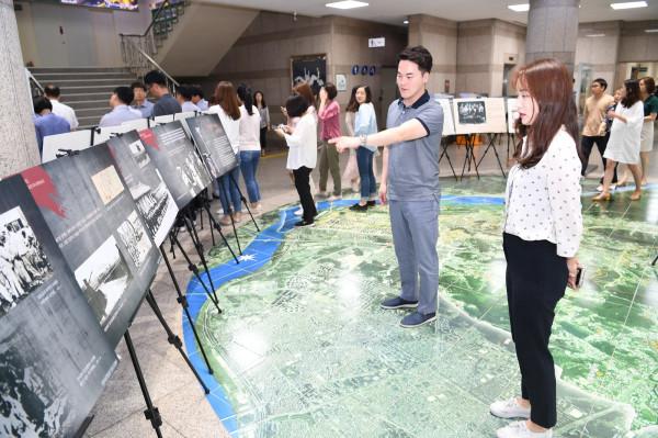 광복회 경기도지부 하남시지회는 호국보훈의 달을 맞아 오는 15일까지 하남시청 1층 로비에서 순국선열의 뜻을 기리고자 ‘대한민국 임시정부 사진전’을 개최한다. 사진은 시민들이 사진을 살펴보는 모습. (사진제공=하남시청)