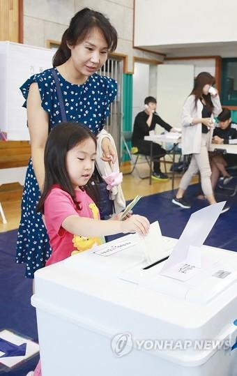 6.13 전국동시 지방선거가 실시된 13일 오전 서울 용산구 이태원초등학교 교육문화관에 마련된 투표소에서 투표를 마친 엄마 대신 아이가 투표함에 투표용지를 넣고 있다.
