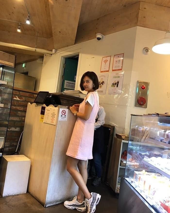 사진 속 황정음은 커피숍으로 보이는 곳에서 핑크 원피스를 입고 뒤돌아 카메라를 응시하고 있다.