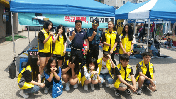 최근 경기 남양주시 금곡동 청소년 주민자치위원회는 점프벼룩시장 행사가 열린 남양주아트센터 앞에서 ‘학교폭력 이제 그만!’이란 주제로 학교폭력 근절 캠페인을 진행했다. 사진은 캠페인에 참여한 학생들이 기념촬영을 하는 모습.(사진제공=남양주시청)