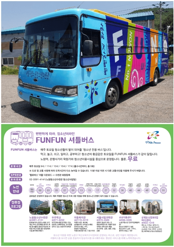 | ▲ 펀펀(FUN FUN)셔틀버스의 외관과 시간표.(사진제공=노원구청) | ||
