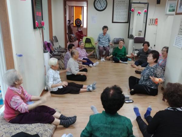 경기 부천시보건소 성곡동 100세 건강실에서는 맷돌체조 프로그램을 운영하고 있다. 맷돌체조 프로그램은 배꼽을 중심으로 전신을 맷돌 도는 방향으로 돌려주는 회전운동이다. 사진은 지난 11일 성곡동 여월 휴먼시아 1단지 아파트 경로당을 방문한 노인들이 체조를 하고 있는 모습.(사진제공=부천시청)