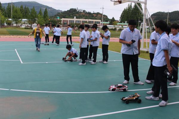 전남 보성군에 소재한 보성중학교는 14일 4차 산업시대를 맞아 창의적인 인재를 육성하고 개인의 진로를 탐색하기 위해 1학년 학생을 대상으로 ‘찾아오는 진로직업교실’을 운영했다. 사진은 자동차공학 분야에 참여한 학생들이 조립한 RC카를 이용해 경주를 하고 있는 모습.(사진제공=전남도교육청)