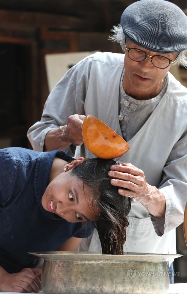 2018년 단오인 18일 오전 서울 종로구 국립민속박물관에서 열린 '여름맞이 단오' 행사에서 창포물 머리감기 체험이 진행되고 있다.