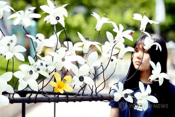 지난 16일 오후 서울 송파구 롯데마트 잠실점에서 열린 2018 환경보호 '일회용품 줄이기' 캠페인에서 시민이 재활용품으로 만든 조형물을 살펴보고 있다.