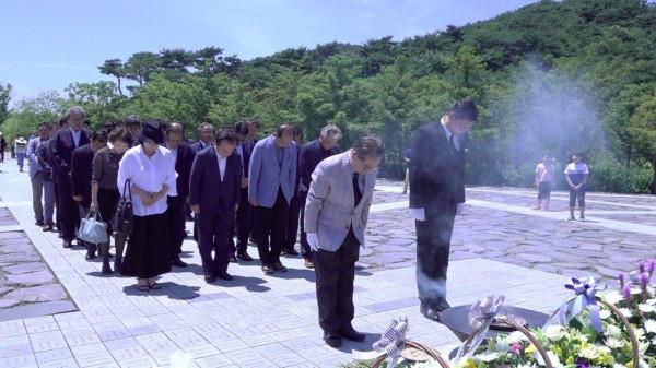 6.13지방선거에서 승리하며 재선에 성공한 이재정 경기도교육감이 지난 16일 경남 김해시 봉하마을을 방문해 노무현 전 대통령 묘역을 참배하고 있다. (사진제공=경기도교육청)