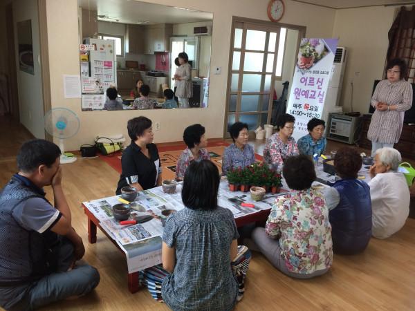 경기 이천시 백사면 주민자치위원회는 ‘2018 찾아가는 읍면동 프로그램’으로 ‘어르신 원예교실’을 진행하고 있으며, 지난 14일 송말2리 경로당에서 첫 수업을 개최했다. 사진은 첫 수업에 참가한 송말2리 노인들이 교육받고 있는 모습. (사진제공=이천시청)
