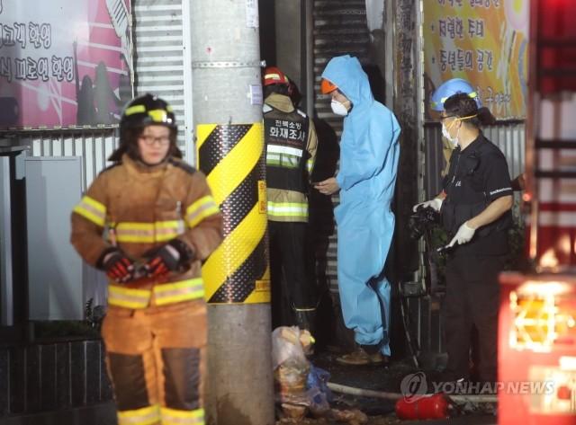 17일 오후 9시 53분께 전북 군산시 장미동 한 주점에서 불이 나 3명이 숨지고 30명이 다치자 경찰과 소방당국이 현장에서 화재 감식을 하고 있다.