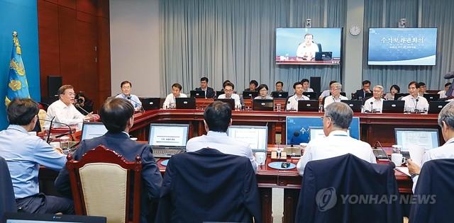 문재인 대통령이 18일 오후 청와대 여민관 대회의실(영상회의실)에서 열린 수석ㆍ보좌관회의를 주재하고 있다. 이날 수석·보좌관 회의는 진행 상황 전체를 청와대 전 직원에게 처음으로 생중계한다. 김의겸 대변인은 “실시간 중계로 국정철학과 대통령 지시사항, 논의 내용을 폭넓게 공유하자는 취지”라고 밝혔다.
