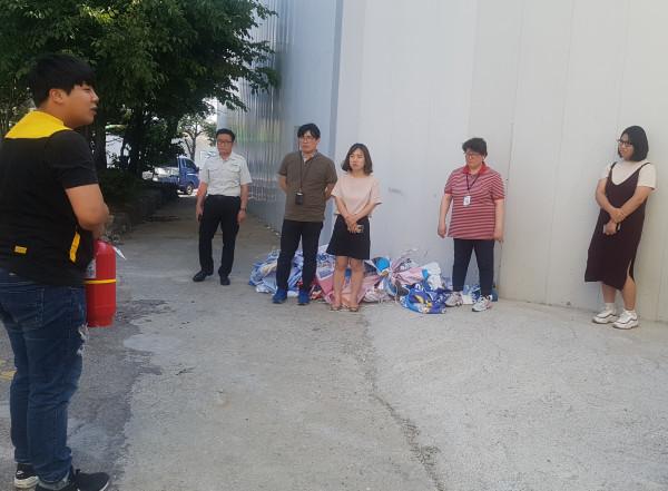 경기 수원시 팔달구 고등동은 18일 ‘2018년 상반기 소방훈련’을 실시했다. 사진은 고등동 직원과 민원인, 주민자치센터 프로그램 수강생 등이 소방점검업체 관계자에게 소화기 사용방법에 대한 설명을 듣고 있는 모습. (사진제공=팔달구청)