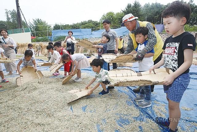 19일 오후 서울 서초구 양재천변 보리밭에서 열린 ‘보리수확 전통체험 행사’에서 어린이들이 탈곡체험을 하고 있다.