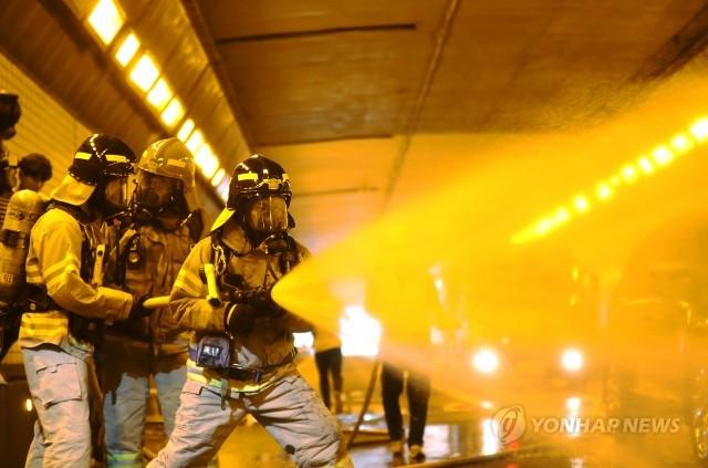 19일 서울 남산1호터널에서 열린 화재사고 대비 합동훈련에 참가한 소방대원들이 진화작업을 펼치고 있다.