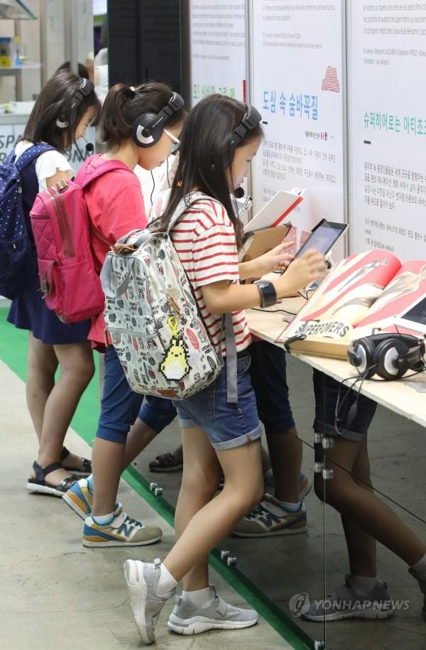 20일 오전 서울 삼성동 코엑스에서 개막한 국내 최대 책 축제 '서울국제도서전'에서 어린이들이 전자책을 보고 있다.
