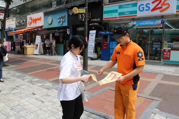 경기 군포소방서는 지난 19일 산본 로데오거리에서 주택용 소방시설 설치 홍보 및 여름철 물놀이 안전사고 방지를 위한 캠페인을 전개했다. 사진은 소방관이 시민에게 홍보 전단지를 건네는 모습. (사진제공=군포소방서)