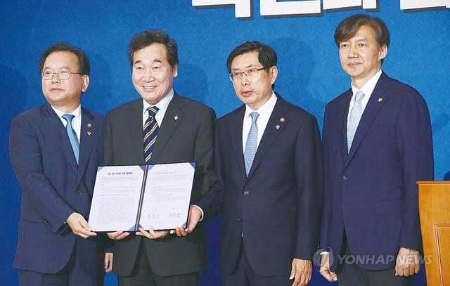 김부겸 장관(왼쪽부터)과 이낙연 국무총리, 박상기 장관, 조국 청와대 민정수석이 21일 오전 서울 종로구 정부서울청사 별관에서 검경 수사권 조정 합의문에 서명한 뒤 기념촬영을 하고 있다.