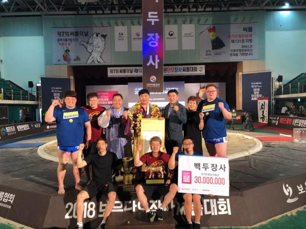 경기 양평군청 씨름선수단의 남영석, 장성복, 이재안 선수는 지난 16~21일 충북 보은군에서 열린 ‘2018 보은단오장사씨름대회’에 출전해 각각 백두장사와 백두급 1품, 태백급 1품을 차지했다. 사진은 이번 대회에 참여한 선수 등 관계자들이 기념촬영을 하는 모습.(사진제공=양평군청)