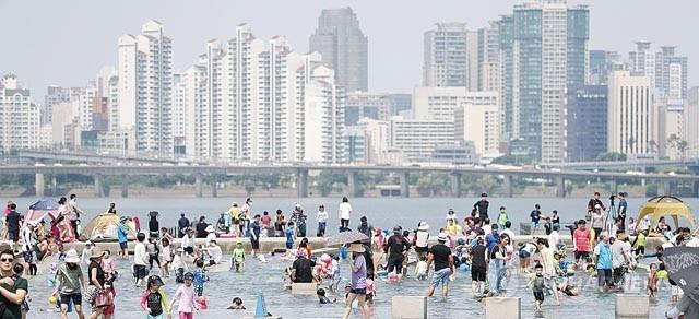 전국 대부분 지역에 폭염특보가 내려진 24일 서울 여의도 물빛광장이 물놀이를 즐기는 시민들로 붐비고 있다.