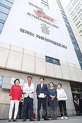 24일 오전 서울 여의도 자유한국당 당사 앞에서 전현직 당협위원장들이 주축이된 자유한국당 재건비상행동 회원들이 당 및 인적쇄신을 위한 정풍운동의 대상자 1차 명단 발표를 하고 있다. 재건위 측은 명단에 포함된 홍준표 전 대표와 김무성 의원에게 정계은퇴를 권고했다.