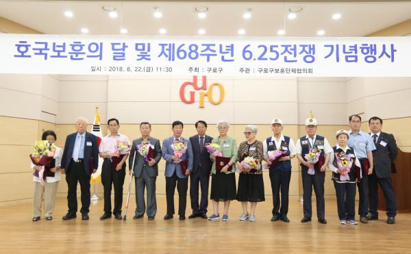 서울 구로구가 구청 강당에서 구 보훈단체와 6.25 참전유공자회 회원 등 200여명과 함께 ‘호국보훈의 달 기념행사’를 열고 모범 국가유공자 24명에게 표창장을 수여했다. 사진은 이성 구청장(왼쪽 6번째)이 표창수여자들과 기념촬영을 하고 있는 모습. (사진제공=구로구청)
