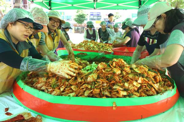 도봉구는 지난 21일 구청 광장에서 자원봉사자 80여명이 참석한 가운데 건강한 여름나기 프로젝트의 일환으로 김치나눔행사인 ‘여름애(愛) 행복나눔 김치’를 진행했다. 사진은 행사에 참여한 자원봉사자들이 김치를 담고 있는 모습. (사진제공=도봉구청)