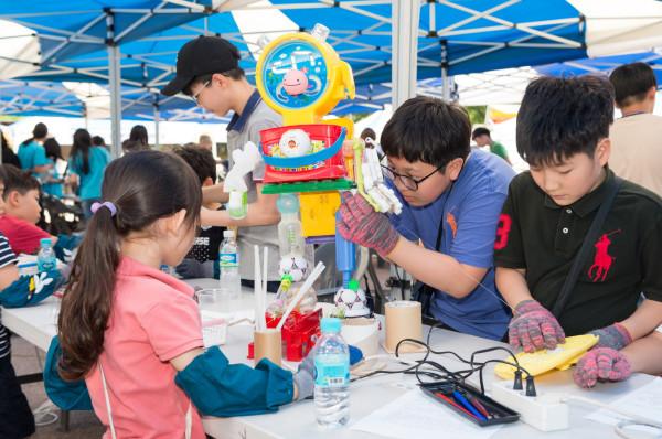 지난 23일 오전 서울시 양천구 양천공원에서 열린 '2018 양천 green 한마당' 의 부대행사로 진행된 ‘토이정크 아트 대회’에 참여한 학생들이 폐장난감 조각으로 새로운 작품 만들고 있다. (사진제공=양천구청)