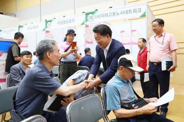 박승원 경기 광명시장 당선인은 최근 광명시청에서 열린 '2018 광명 소담한 일자리 박람회'에 참석했다. 이날 박 당선인은 시장 직속 일자리위원회를 설치하고 맞춤형 일자리 창출에 최선을 다하겠다는 뜻을 전했다. 사진은 박 당선인이 시민과 악수를 하는 모습. (사진제공=광명시청)