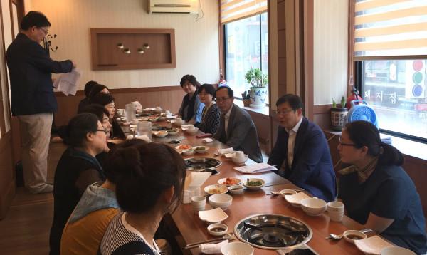 경기 수원시 영통구는 25일 ‘찾아가는 어린이집 인형극’ 관계자와의 간담회를 했다. 사진은 박래헌 구청장 및 수원시소리샘, 어린이집 연합회 임원 등이 이야기를 나누는 모습. (사진제공=영통구청)