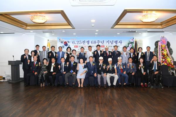 경기 구리시는 25일 대한민국 6.25참전유공자회 구리시지회의 주관으로 인창동 소재 스칼라디움에서 ‘6.25전쟁 제68주년 기념식’을 개최했다. 사진은 행사에 참석한 윤호중 국회의원을 비롯한 관계자들이 기념촬영을 하는 모습. (사진제공=구리시청)