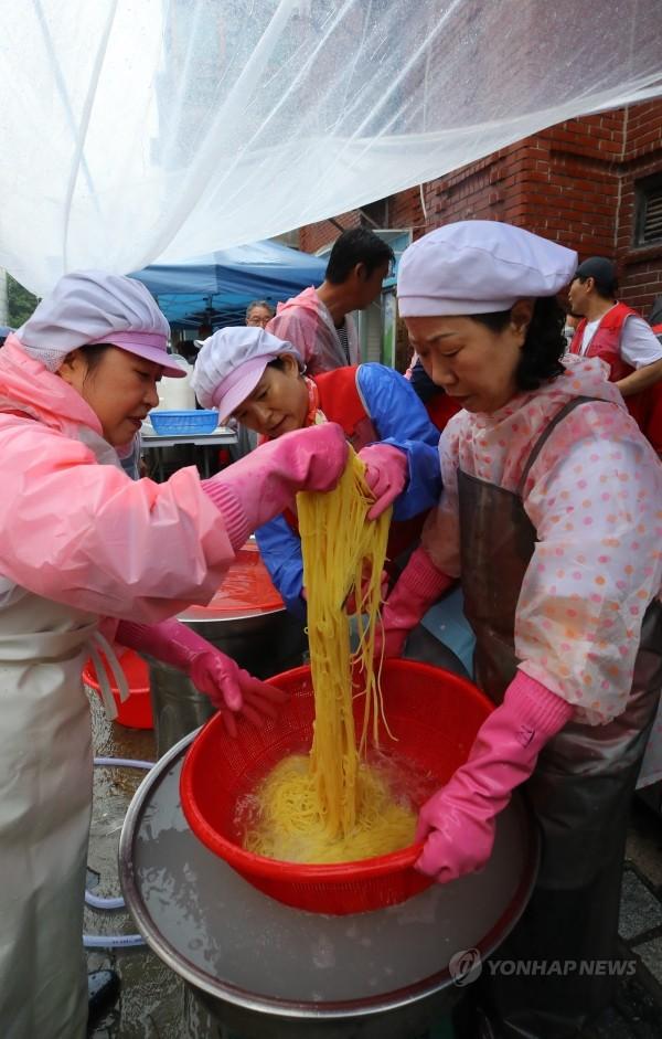 장맛비가 내리는 26일 오전 서울 용산구 동자동 모리아교회에서 강동무료중식봉사회와 묵담봉사회 자원봉사자들이 '사랑의 자장면 1500명 나눔의 잔치'를 열고 쪽방촌 주민들에게 점심을 제공하기 위해 자장면을 만들고 있다.