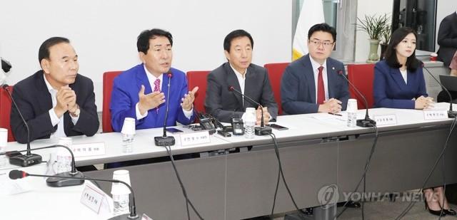 자유한국당 안상수 혁신 비상대책위원회 준비위원장(왼쪽 두 번째)이 26일 오전 국회 본관 당 대표실에서 열린 신 비상대책위원회 구성을 위한 준비위원회 1차 회의에서 발언하고 있다. 왼쪽부터 박덕흠 위원, 안상수 혁신 비상대책위원회 준비위원장, 김성태 당대표 권한대행, 김성원 위원, 배현진 위원.