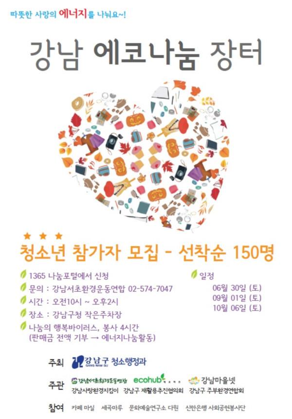 [시민일보=이대우 기자] 서울 강남구가 오는 30일 구청 작은주차장에서 청소년과 함께 하는 ‘강남 에코나눔장터’를 개최한다.