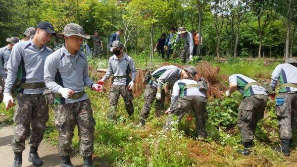 경기 남양주시는 27일 한강유역환경청과 화도행정복지센터, 제133공병대대, 한국도로공사 직원 등이 참석한 가운데 북한강변 1만㎡ 일원에서 '교란식물 퇴치활동'을 전개했다. 사진은 군 장병들이 퇴치활동에 참여한 모습. (사진제공=남양주시청)