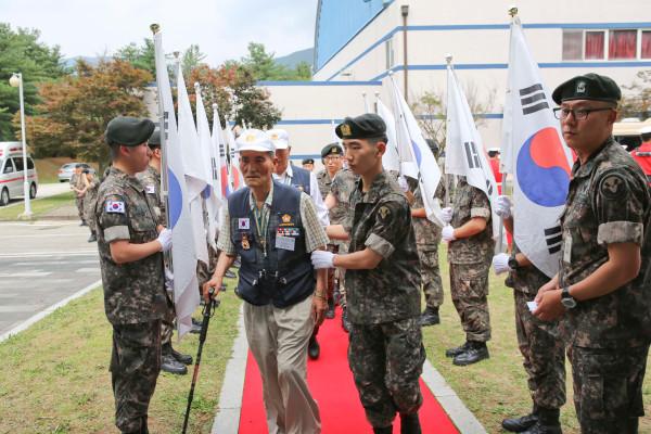 경기 포천시 소재 육군 제5군단은 6.25 참전용사들의 희생정신을 되새기자는 취지에서 ‘2018년 6.25전쟁 참전용사 초청행사’를 개최했다. 사진은 행사에 참석한 참전용사들이 군 장병의 안내를 받아 이동하는 모습.(사진제공=포천시청)