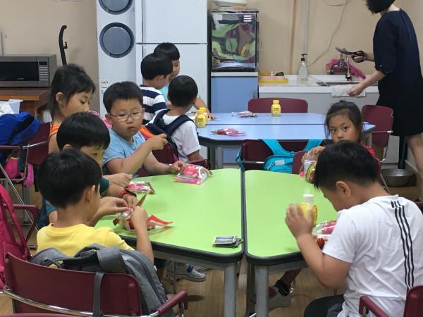 전남 진도군은 지난 6월 말부터 올해 말까지 ‘초등돌봄교실 과일간식 지원 시범사업’을 추진한다. 과일 간식은 예산 1500만원을 투입해 학생에게 무상으로 지원되며, 9개 초등학교 총 252명을 대상으로 1인당 150g 내외의 조각 과일이 공급된다. 사진은 어린이들이 조각 과일을 먹고 있는 모습.(사진제공=진도군청)