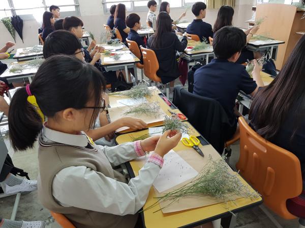 | ▲ 서울 성동지역의 중학생들이 직업체험의 일환으로 강사지도에 따라 플로리스트 체험을 하고 있는 모습. (사진제공=성동구청) | ||