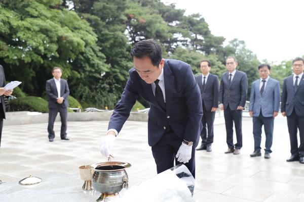 정장선 경기 평택시장이 2일 민선7기 평택시장 취임식을 취소하고 평택호 현충탑을 참배했다. 이어 정 시장은 종합상황실에서 간부공무원만 참석한 가운데 취임 선서를 한 후 재난 상황실에서 태풍(쁘라삐룬)으로 인한 피해상황을 보고 받고 본격적인 재난 업무를 시작했다. 사진은 현충탑 참배 중인 정 시장의 모습. (사진제공=평택시청)